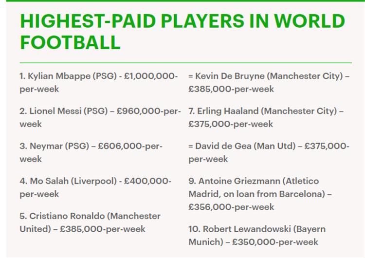 ويحتل صلاح البالغ من العمر 30 عامًا ، المركز الرابع بقائمة أفضل لاعب كرة قدم في العالم ، لكن راتبه يتضاءل مقارنة بأولئك الذين يلعبون في نادي باريس سان جيرمان، حيث يأتي نيمار في المركز الثالث برصيد 606000 جنيه إسترليني أسبوعيًا، ولكن هناك قفزة كبيرة إلى المركزين الأولين.