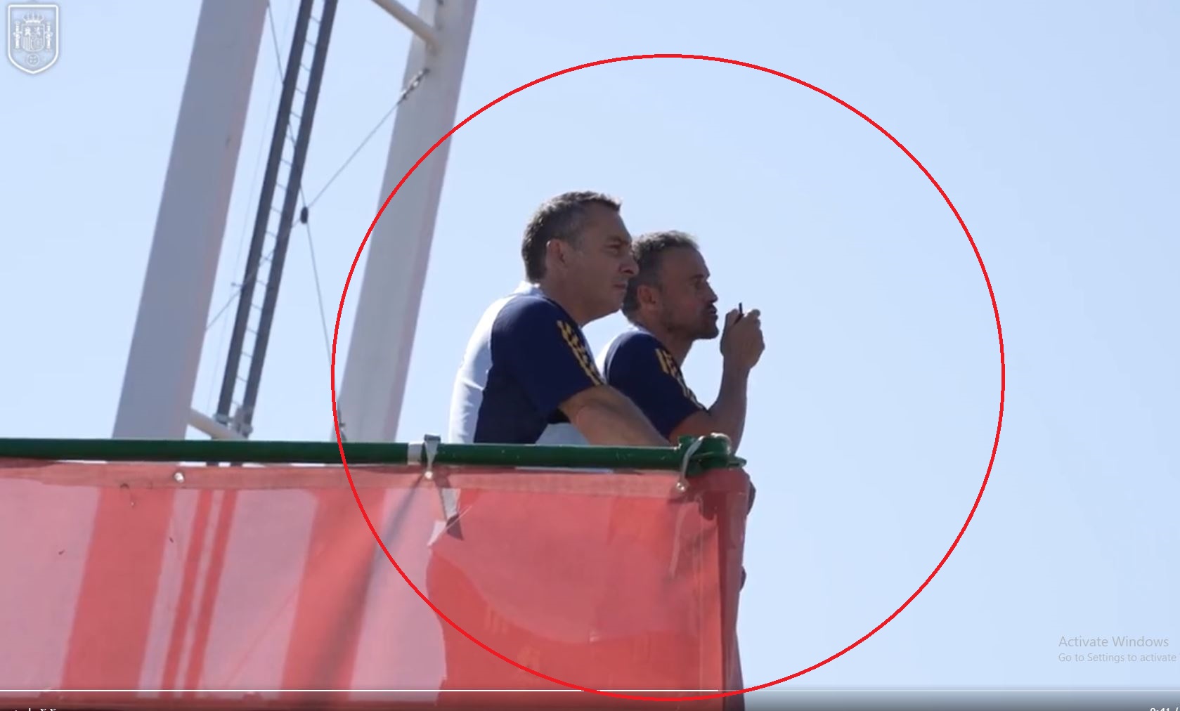 ويظهر بالفيديو انريكي جالساً على مدرجات مرتفعة وهو يراقب تحركات اللاعبين في الملعب ويتحدث لكل لاعب مباشرة أثناء التدريب، عبر جهاز لاسلكي فيما هناك جهاز مثبت على ظهر كل لاعب في المنتخب تصله من خلاله التعليمات بصوت واضح بسماعة أذن بدلاً من صراخ المدرب عليه وعملية التوجيه عن بعد.
