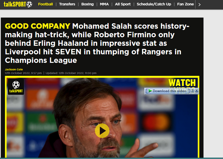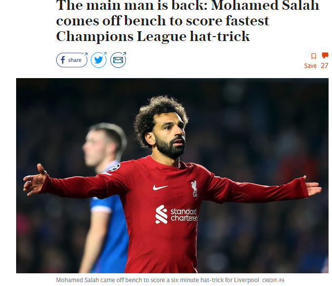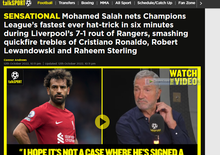 وفي مقال آخر نشرت “توك سبورت” قائله: ”صلاح يسجل أسرع ثلاثية في دوري أبطال أوروبا على الإطلاق وذلك في ست دقائق خلال فوز ليفربول 7-1 على رينجرز “.