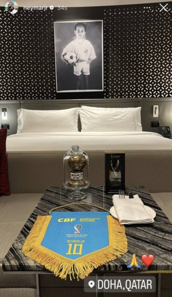 ونشر البرازيلي نيمار عبر حسابه الرسمي على "إنستغرام"، تظهر غرفته في فندق الإقامة، والصورة المتواجدة في الغرفة، وعلى الفوز تفاعل نادي سانتوس البرازيلي عبر حسابه على "تويتر" مع الصورة التي نشرها نيمار، بتغريدة جاء فيها: "لا توجد صورة رمزية أكثر من تلك، نتمنى التوفيق لنيمار، وأن يعود بكأس العالم السادسة في تاريخ البرازيل". ومن جانب أخر وكعادته دائماً نشر نيمار صورة توثق لحظة وصول بعثة منتخب البرازيل إلى مطار الدوحة مساء السبت بأزياء رسمية، وكتب "لاعب كرة ببدلة فنان".