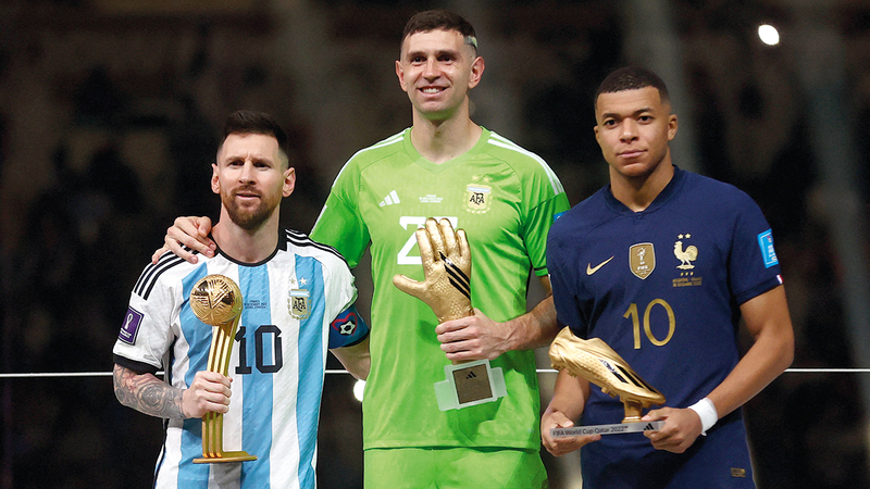 مارتينيز يتوسط مبابي وميسي خلال تتويجهم بالجوائز الفردية للمونديال. أ.ف.ب