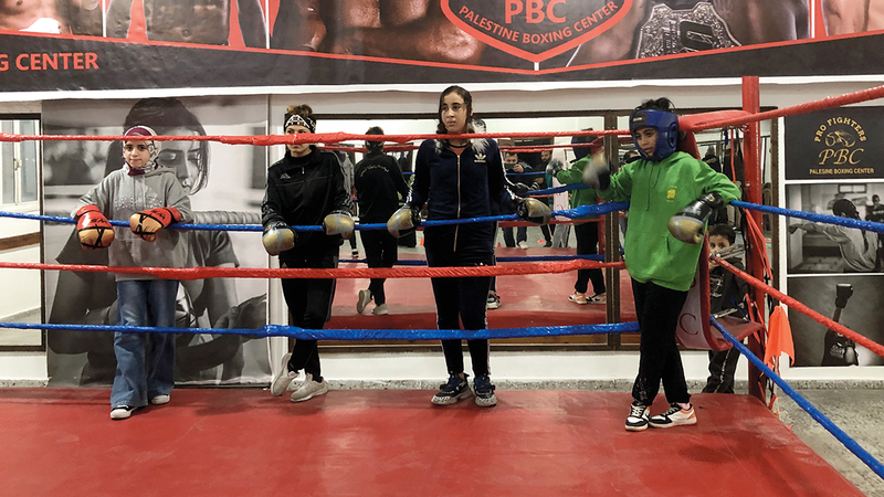 حضرت «الإمارات اليوم» إحدى جلسات التدريب بالمركز الفلسطيني لملاكمة الفتيات، داخل قاعة مخصصة لهن في نادي المشتل الرياضي، حيث تتوسطها حلبة الملاكمة المُعدة وفقاً للمعايير العالمية، فيما تحيطها المجسمات المطاطية صغيرة الحجم وكبيرته، لممارسة الفتيات التدريبات بشكل سليم.