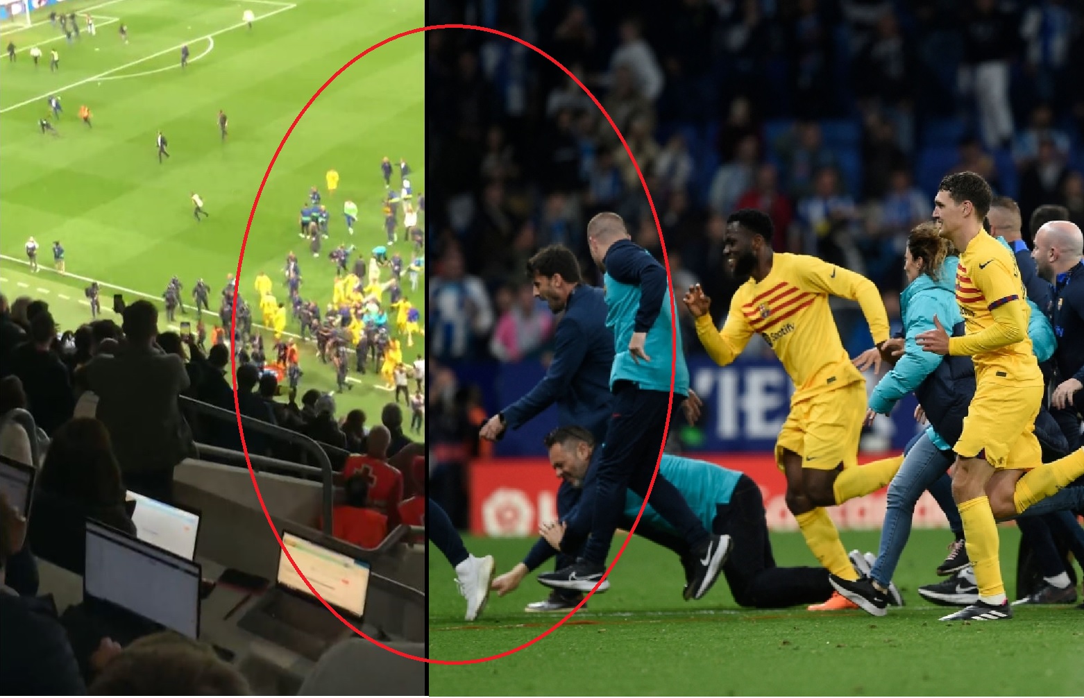 وكانت جماهير إسبانيول قد اقتحمت الملعب أثناء احتفالات لاعبي برشلونة بالدوري مما تسبب بحالة هلع وهروب للفريق الضيف نحو غرفة تبديل الملابس في مشهد نادر في أحد الدوريات الخمس الكبرى في أوروبا.