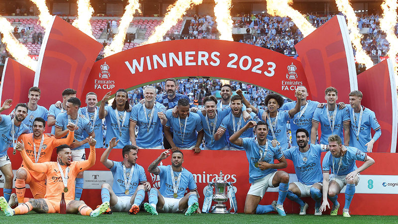 ظفر مانشستر سيتي بلقب مسابقة كأس إنجلترا في كرة القدم على حساب جاره وغريمه اللدود مانشستر يونايتد 2-1، أمس، بفضل ثنائية الألماني إيلكاي غوندوغان، ليواصل رجال المدرب الإسباني بيب غوارديولا مسار حلم ثلاثية تاريخية. ويواصل نادي مانشستر سيتي المملوك لسمو الشيخ منصور بن زايد آل نهيان نائب رئيس الدولة، نائب رئيس مجلس الوزراء وزير ديوان الرئاسة،تألقه في الموسم الحالي، حيث يقدم كرة قدم جميلة بقيادة المدرب غوارديولا، وبات على موعد مع ثلاثية تاريخية نادرة، فبعد أن توج بطلاً للدوري الإنجليزي الممتاز، وأحرز أمس لقب كأس إنجلترا، يحتاج إلى لقب واحد فقط حين يواجه إنتر ميلان الإيطالي في نهائي دوري أبطال أوروبا السبت المقبل في استاد أتاتورك الدولي بمدينة إسطنبول التركية، وذلك لإكمال حصد الثلاثية التاريخية.