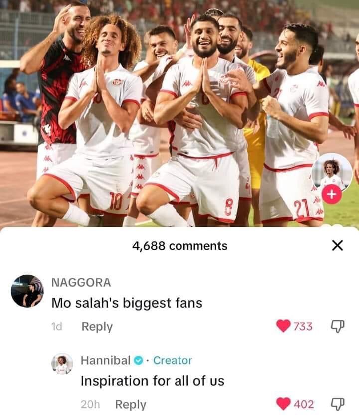 وعلق اللاعب على صورة احتفال منتخب تونس والتي أثارت الجدل في مواقع التواصل الاجتماعي، وقال حنبعل مجبري، عن محمد صلاح: " مصدر إلهام لنا"، ليؤكد بذلك حبه وتقديره للنجم المصري.