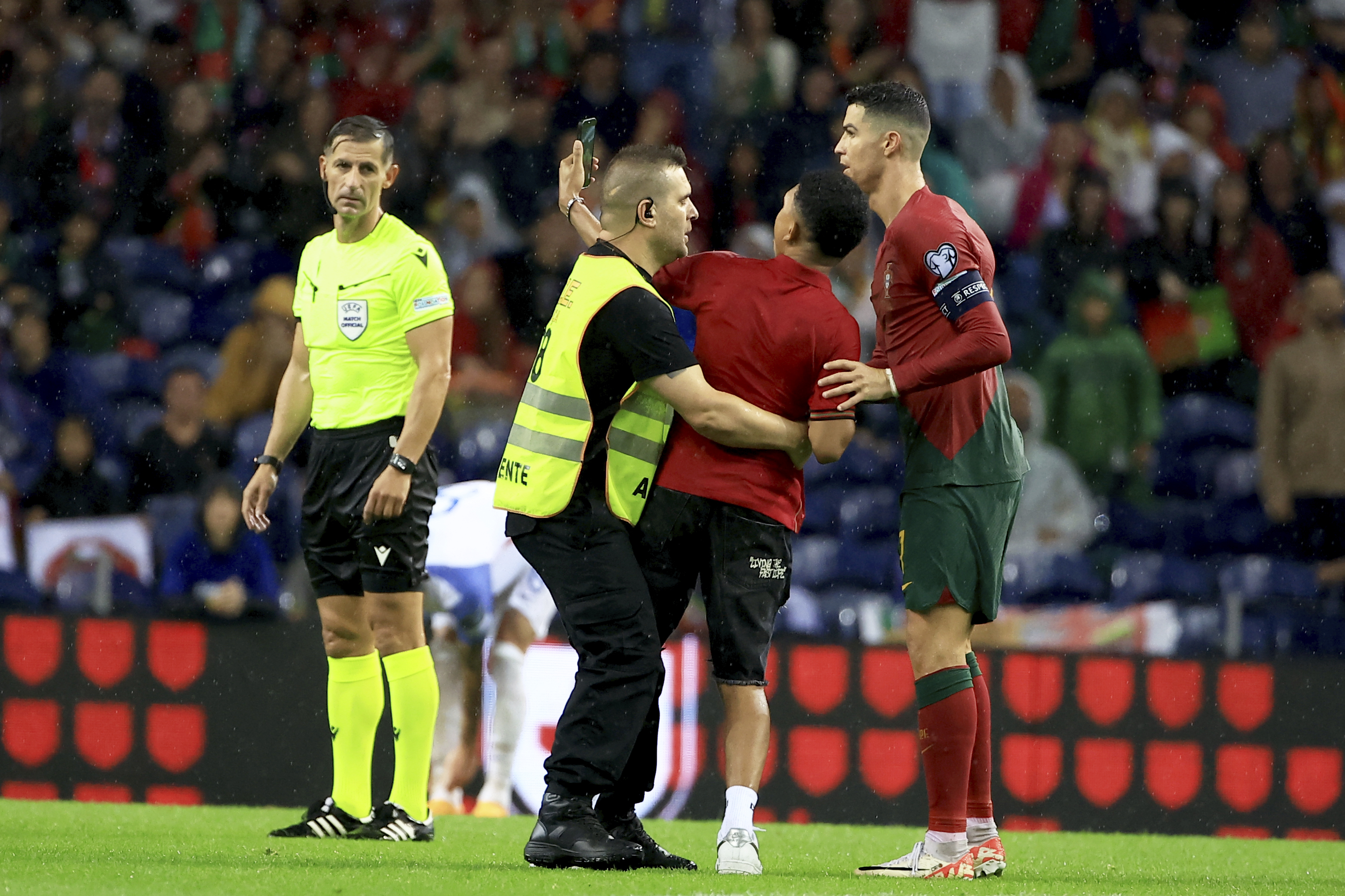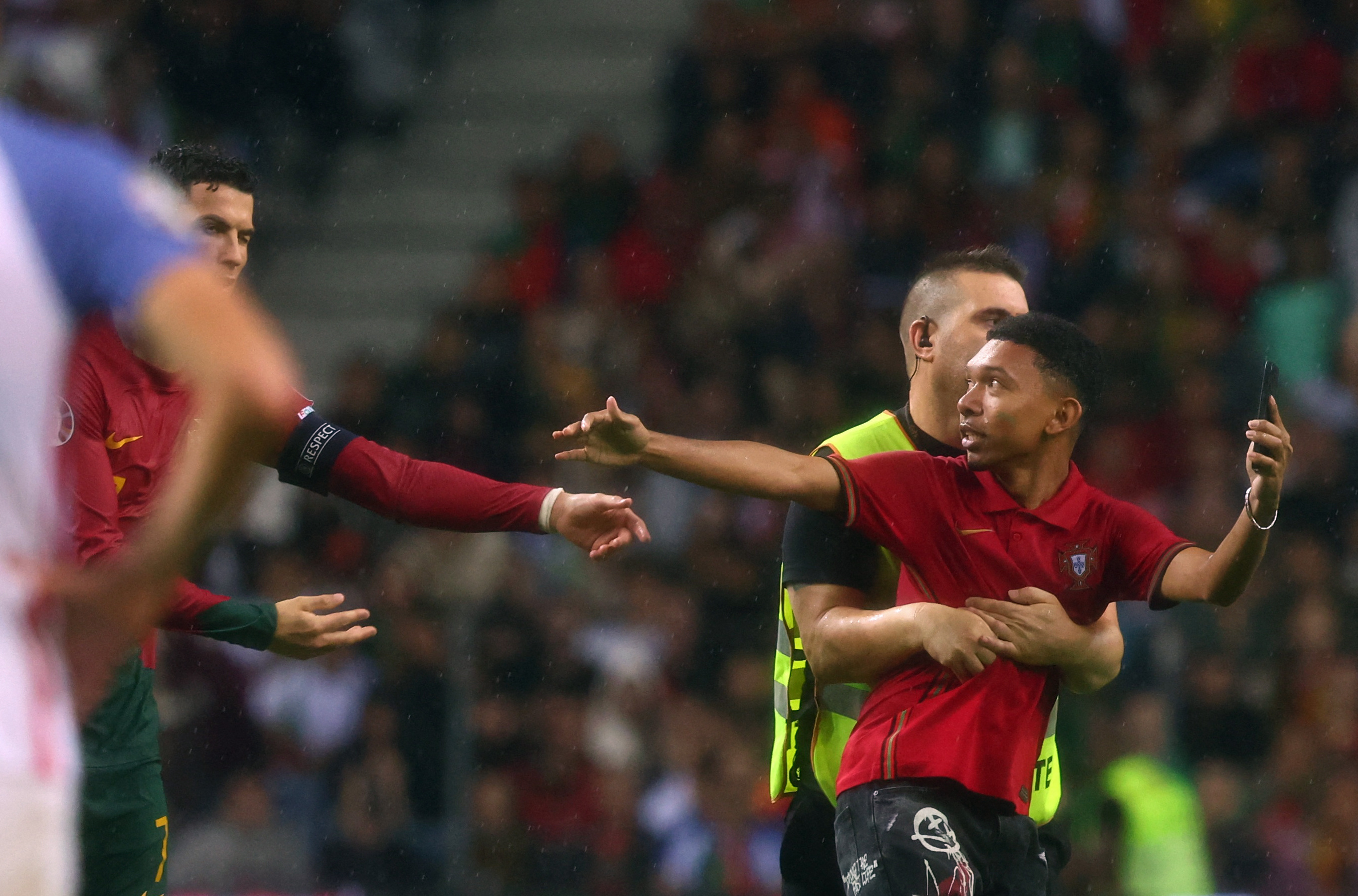 شهدت مباراة البرتغال وسلوفاكيا في تصفيات بطولة أمم أوروبا موقفاً غريباً عندما نجح مشجع برتغالي في أي يصبح حديث العالم بطريقته الجديدة في الاقتحام من أجل الوصول إلى رونالدو، والاحتفال معه بطريقته.