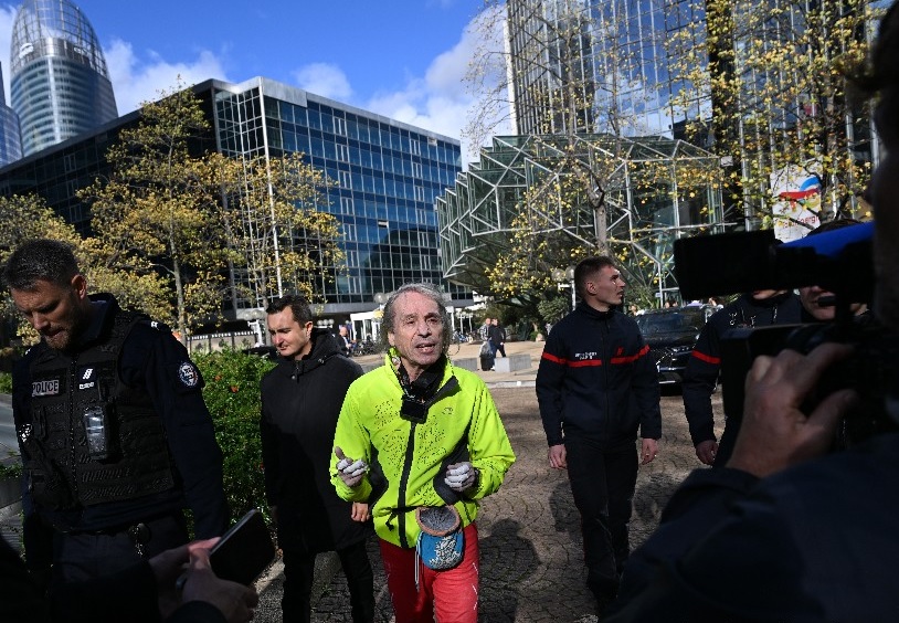 بسترة صفراء وسروال أحمر وأحذية تسلق، أنجز آلان روبير مغامرة تسلق برج توتال الذي يبلغ علوه 179 مترا، على مرأى من المارة في هذا الحي المالي. وقالت محافظة أوت دو سين إن السلطات المحلية أوقفت الرجل بعد نزوله من البرج.