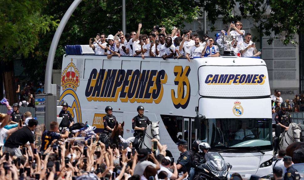 واحتشد الآلاف من المشجعين لاستقبال حافلة الفريق التي طافت أرجاء العاصمة قبل توجهها إلى إلى مكان الاحتفال التقليدي للنادي في ميدان سيبيليس. وجرى تسليم كأس البطولة خلال مراسم احتفالية في المركز التدريبي للنادي. واعتاد ريال مدريد على الاحتفال بالألقاب في ملعب سانتياجو برنابيو لكن الاستاد يستعد لاستضافة حفل موسيقي اليوم. وقال فلورنتينو بيريز رئيس ريال مدريد "الفريق تخطى وضعا بدا وأنه لا يمكن تجاوزه"،في إشارة إلى موجة من الإصابات التي ضربت اللاعبين في وقت مبكر من الموسم.