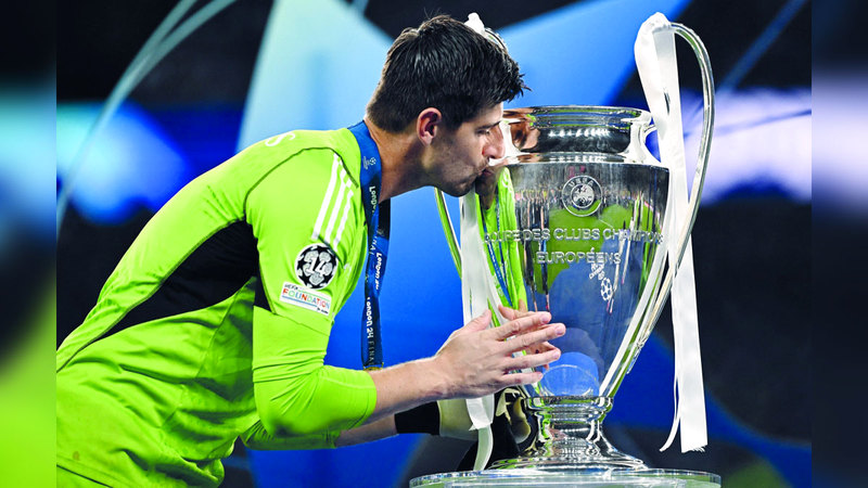 حارس ريال مدريد كورتوا يقبِّل كأس دوري أبطال أوروبا. رويترز