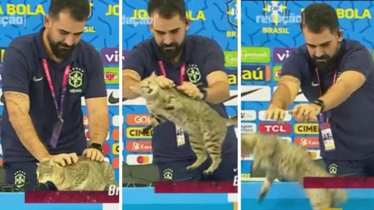 وأثناء بطولة كأس العالم 2022 في قطر، ألقى المسؤول الصحافي لمنتخب البرازيل بشيء من العنف قطاً وجده على طاولة المؤتمر.