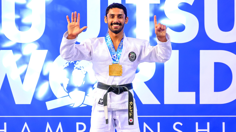 بطل منتخب الجوجيتسو خالد الشحي يحتفل بالذهب على طريقته الخاصة. من المصدر