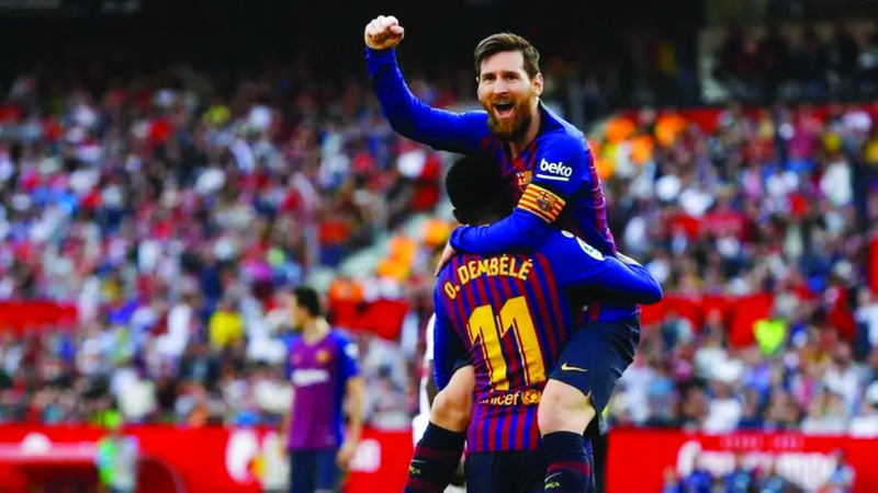 ديمبيلي يحتفل بأحد أهداف ميسي مع برشلونة. أرشيفية