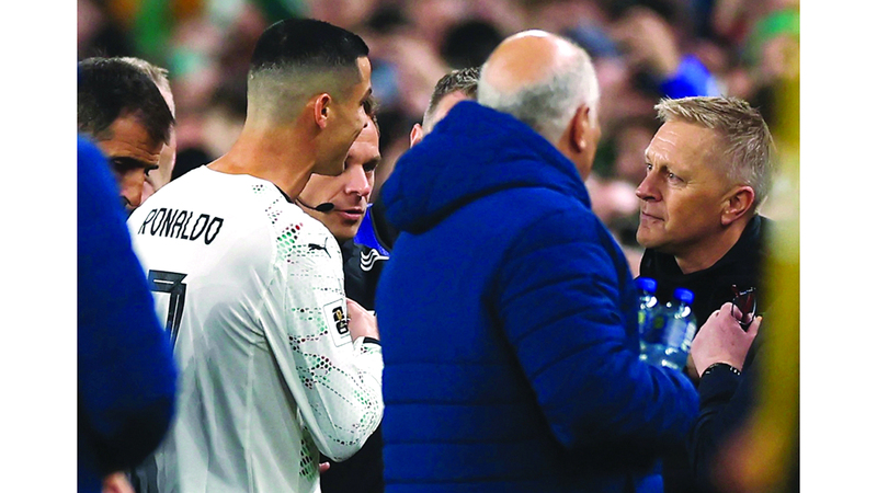 رونالدو في حديث غاضب مع مدرب إيرلندا هالغريمسون. رويترز