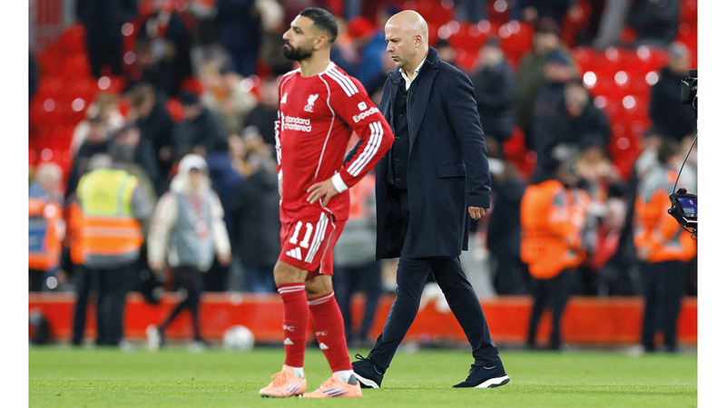 الحزن يسيطر على سلوت ومحمد صلاح بعد الهزيمة القاسية أمام أيندهوفن. رويترز