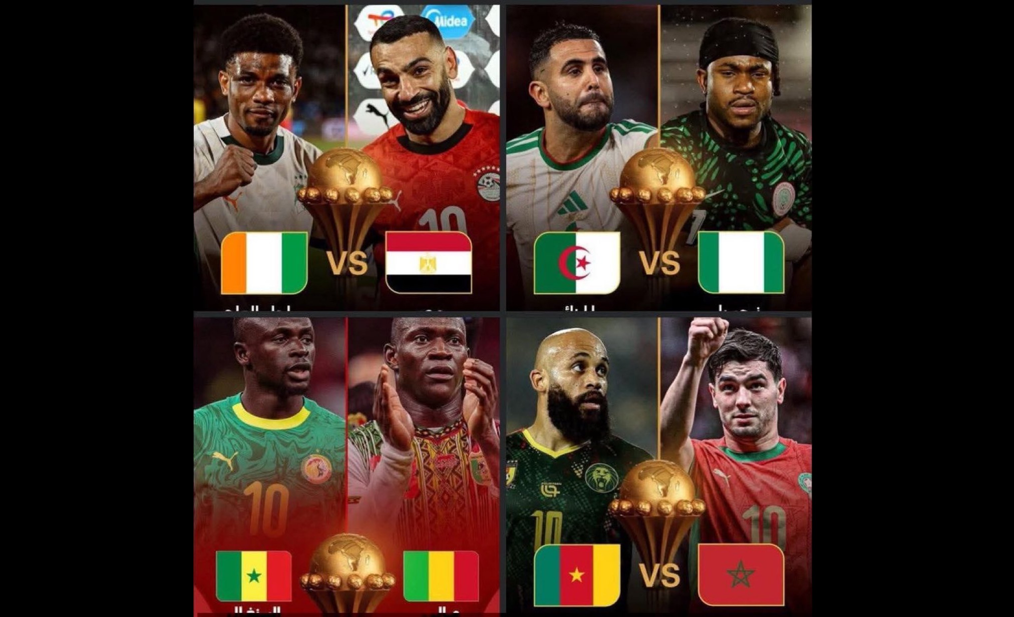 ويلعب الفائز من مباراة المغرب والكاميرون (الجمعة الساعة 23:00 بتوقيت الإمارات) مع الفائز من مباراة الجزائر ونيجيريا (السبت الساعة 20:00 بتوقيت الإمارات)، والفائز من مواجهة مصر وساحل العاج (السبت الساعة 23:00 بتوقيت الإمارات) مع الفائز من مواجهة السنغال ومالي (الجمعة الساعة 20:00).