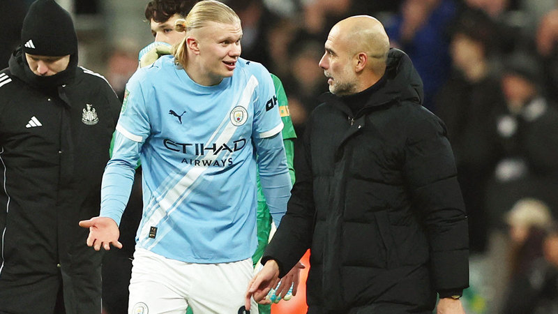 غوارديولا وهالاند خلال مباراة نيوكاسل. رويترز