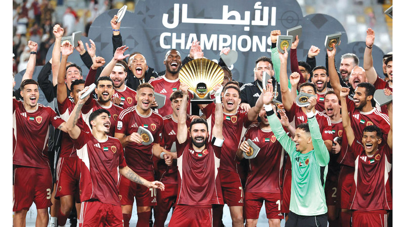 لاعبو الوحدة متوجين بدرع التحدي الإماراتي - القطري بعد الفوز على الدحيل. تصوير: إريك أرازاس