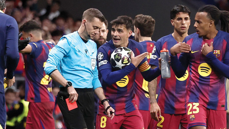 لاعب برشلونة بيدري يتحدث مع الحكم كليمنت توربين بعد طرد المدافع إريك غارسيا في مباراة أتلتيكو مدريد. أ.ب