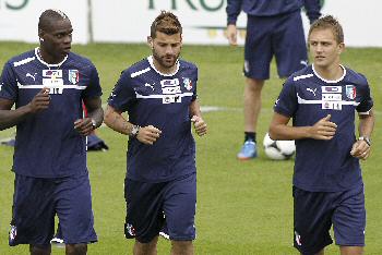 من اليمين: دومينيكو كريشيتو (تم استبعاده بسبب فضيحة التلاعب بالمباريات) و انطونيو نوتشيرينو وماريو بالوتيلي خلال التدريبات قبل إعلان التشكيلة النهائية. أ ب