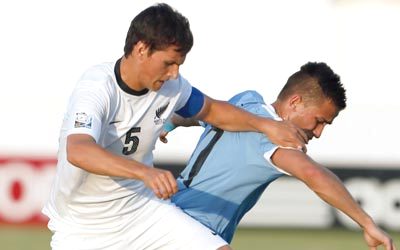 مهاجم أوروغواي رانكو «يمين» يتخطى مدافع نيوزيلندا. أ.ف.ب