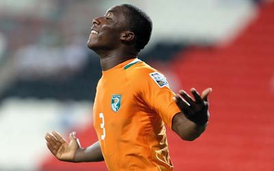 لاعب ساحل العاج ياكو سعيد بالفوز علي نيوزيلندا. تصوير: إريك أرازاس