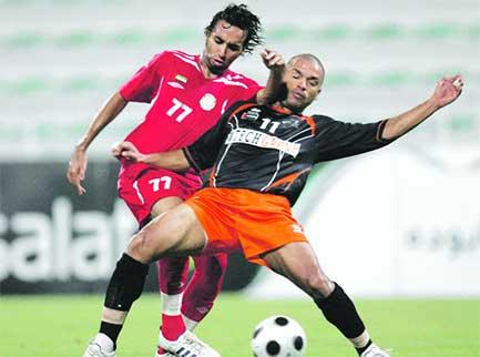 لاعب الفجيرة يوسف خلفان في صراع مع سمير إبراهيم وسط الملعب.تصوير: مصطفى قاسمي