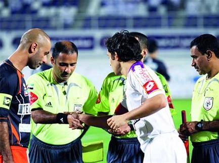 فالديفيا يصافح طاقم تحكيم مباراة العين أمام عجمان. تصوير: ناصر بابو