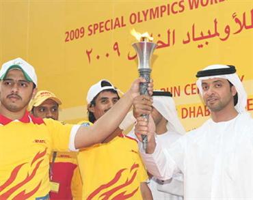 هزاع بن زايد يتسلّم شعلة الأولمبياد الخاص 2009 تصوير: إريك أرازاك