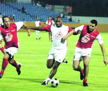 جانب من المباراة التي شارك فيها نجوم العرب خلال مهرجان الاعتزال. تصوير: ساتيش كومار
