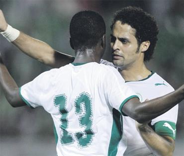 القحطاني يحتفل مع أحمد الموسى بالنتيجة. أ.ف.ب