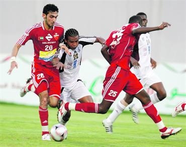 لاعب الوحدة بنغا يحاول اختراق حاجز لاعبي الأهلي. تصوير: جوزيف كابيلان ــ أرشيفية