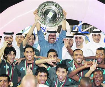 أبطال بني ياس يحتفلون بدرع دوري الدرجة الأولى. تصوير: محمد عبدحكيم
