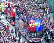 احتفل مليون مشجع لنادي برشلونة الإسباني، أول من أمس، بلاعبي الفريق الكاتالوني خلال مرورهم شوارع المدينة في موكب النصر لدى عودتهم من روما متوجين بلقب أبطال أوروبا على حساب مانشستر يونايتد الإنجليزي، وإنجازهم ثلاثية تاريخية في الموسم الجاري. وكان البارشا قد توّج بلقبي الدوري وكأس ملك إسبانيا في إنجاز غير مسبوق تحت قيادة المدرب الشاب جوزيب غوارديولا.