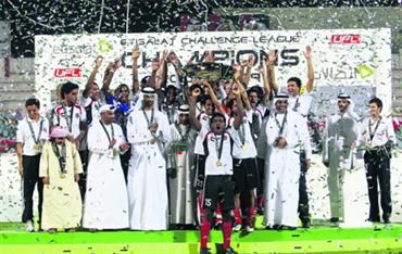 نجوم فريق الجزيرة يرفعون كأس بطولة التحدي لكرة القدم. تصوير: مصطفى قاسمي