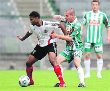 سبيت خاطر يحاول بناء هجمة جزراوية صوب مرمى رابيد فيينا. من المصدر