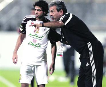 حاتم السويسي يوجّه اللاعب يعقوب الحوسني. تصوير: أسامة أبوغانم