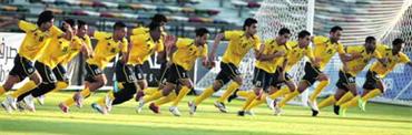 لاعبو المنتخب خلال تدريبات يوم أمس استعداداً للمباراة. تصوير: جوزيف كابيلان