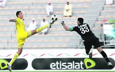 لاعب الوصل بيرس يحاول إسقاط الكرة من فوق حارس الإمارات. تصوير: دينيس مالاري