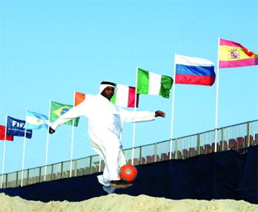 لاعب الإمارات بخيت سعد يركل الكرة إيذاناً ببدء اللعب على شواطئ جميرا. تصوير: أسامة أبوغانم