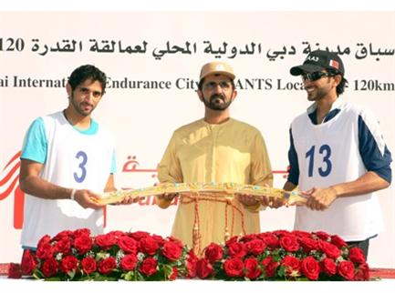 توج صاحب السمو الشيخ محمد بن راشد آل مكتوم نائب رئيس الدولة رئيس مجلس الوزراء حاكم دبي سمو الشيخ حمدان بن محمد بن راشد آل مكتوم ولي عهد دبي والشيخ ناصر بن حمد آل خليفة قائد الفريق الملكي البحريني للقدرة بطلا سباق العمالقة المحلي على كأس دبي لسباق القدرة للخيل والتي أقيمت اليوم في دبي لمسافة 120 كيلومتر.