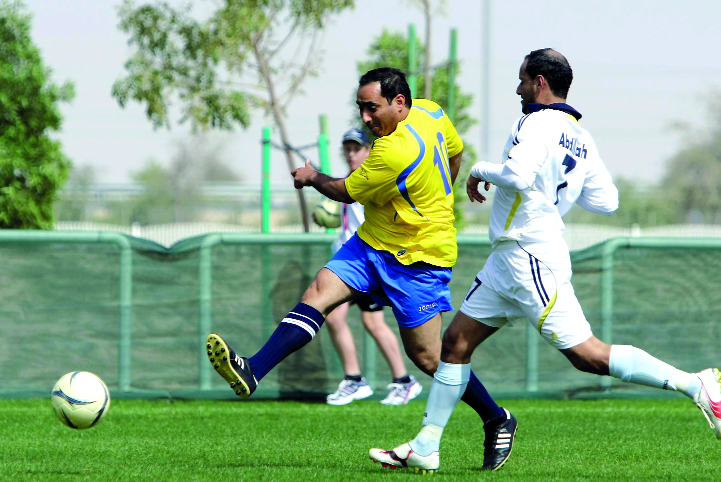 قائد فريق «الإمارات اليوم» سامي الريامي يسدد كرة قوية نحو مرمى شو تايم. تصوير: أسامة أبوغانم