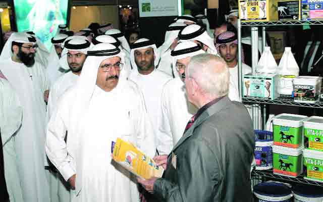 حمدان بن راشد يستمع لشرح من أحد العارضين في معرض دبي للجواد العربي. تصوير: تشاندرا بالان