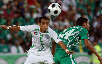 لاعب الإمارات علي ربيع ولاعب الشباب محمد نصار في صراع على الكرة. أ.ف.ب