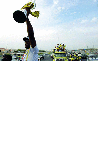 وأطل اللاعبون على الجمهور من خلال الحافلة المكشوفة التي طافت بهم شوارع دبي ترافقها آلاف السيارات المزينة بأعلام الدولة والوشاحات الصفراء، ولاقت المسيرة حضوراً غفيراً وسط أجواء فرح كبيرة عمت دبي، قبل أن تنتهي المسيرة في مقر النادي.