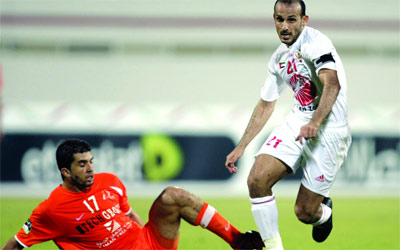العنبري (يمين) يجتاز مدافع عجمان في مباراة سابقة بينهما. تصوير: أسامة أبوغانم