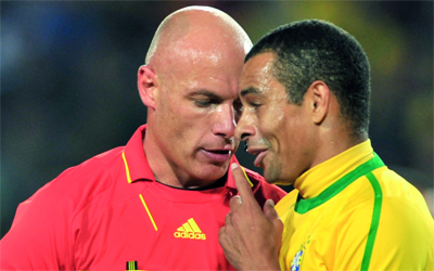 الحكم الإنجليزي ويبي في لقطة طريفة مع لاعب البرازيل جيلبيرتو سيليفا. أ.ف.ب
