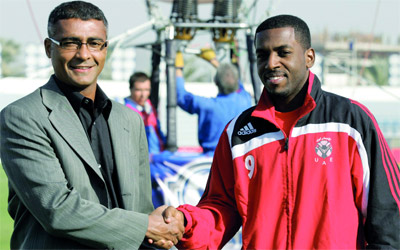 نواف مبارك يصافح اللاعب البرازيلي روماريو دي زوزا فاريا. تصوير: دينيس مالاري