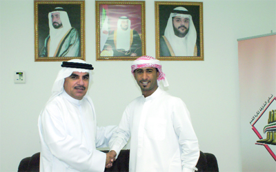 يوسف موسى «يمين» مع عبدالرحيم جاني عقب التوقيع. من المصدر