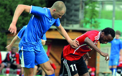 فيصل خليل يجتاز أحد لاعبي الفريق النمساوي. الإمارات اليوم