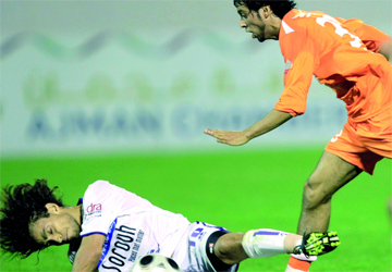 فالديفيا ساقط أرضاً خلال مباراة سابقة للعين وعجمان. تصوير: أسامة أبوغانم